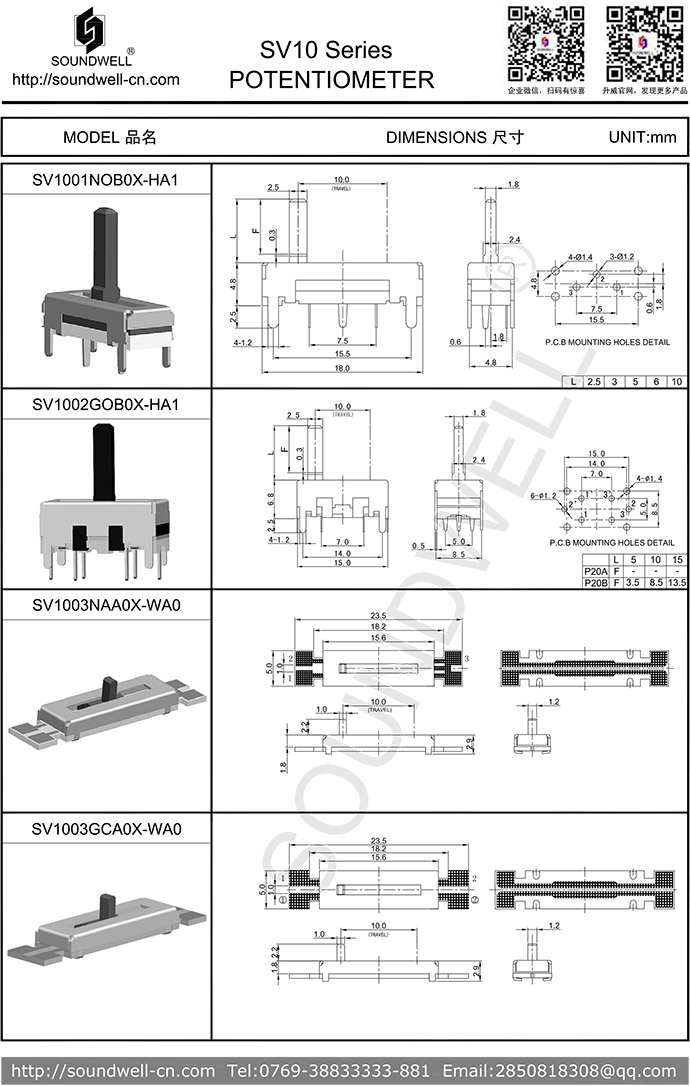 | Main Specifications: | Travel: 10mm; Resistance Tolerance: ±20%; Rated power: 0.05W; Operating temperature: -10℃~70℃; Operating life: 5,000 Min; |