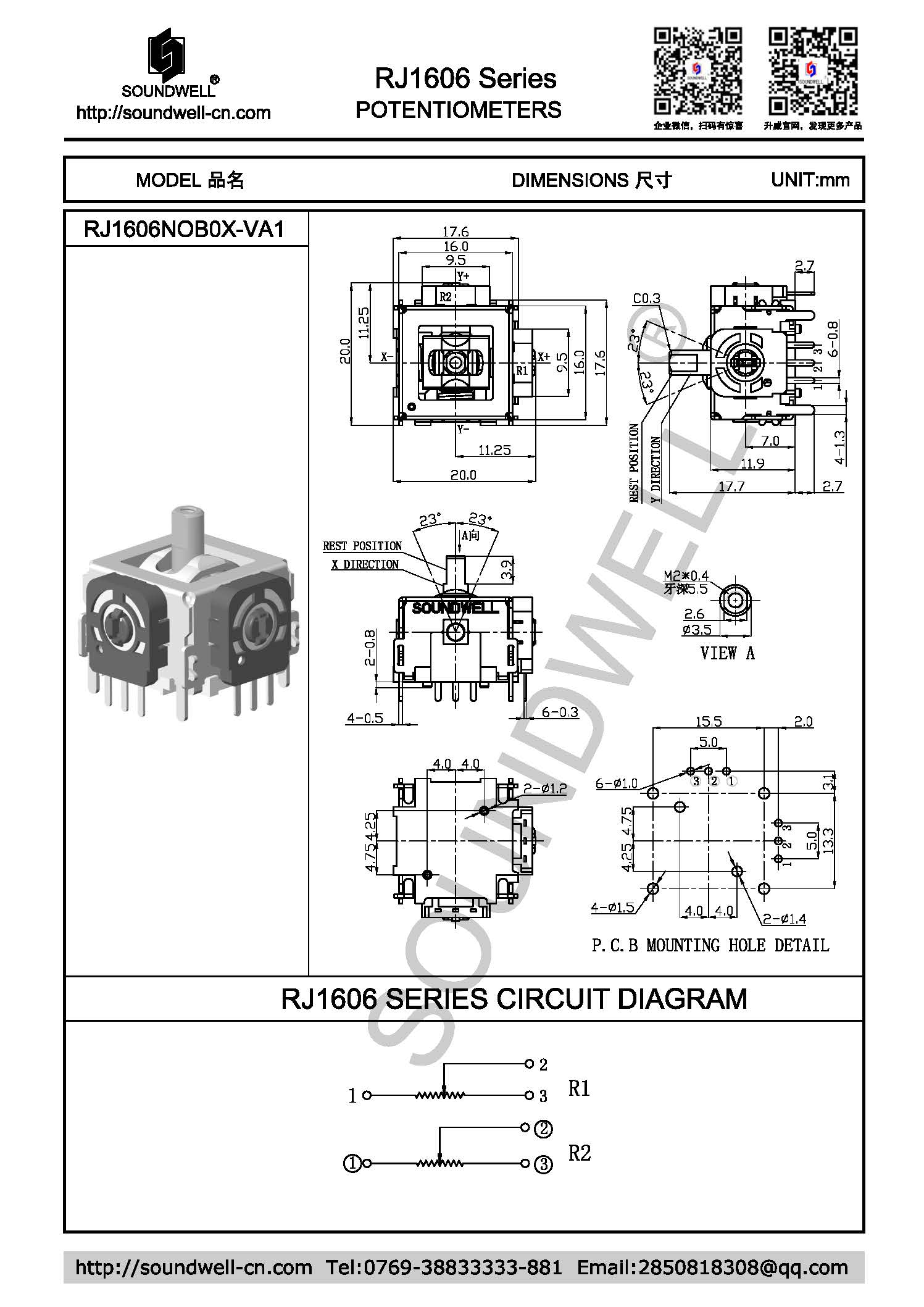 Dimensions: 16mm Rated power: 0.0125W Maximum operating voltage: AC 50V DC 5V Voltage divider error: 44%~56% Operating angle: 23°Max on one side Operating temperature: -10℃~70℃ Rotational life: 1,000,000 cycles Min |