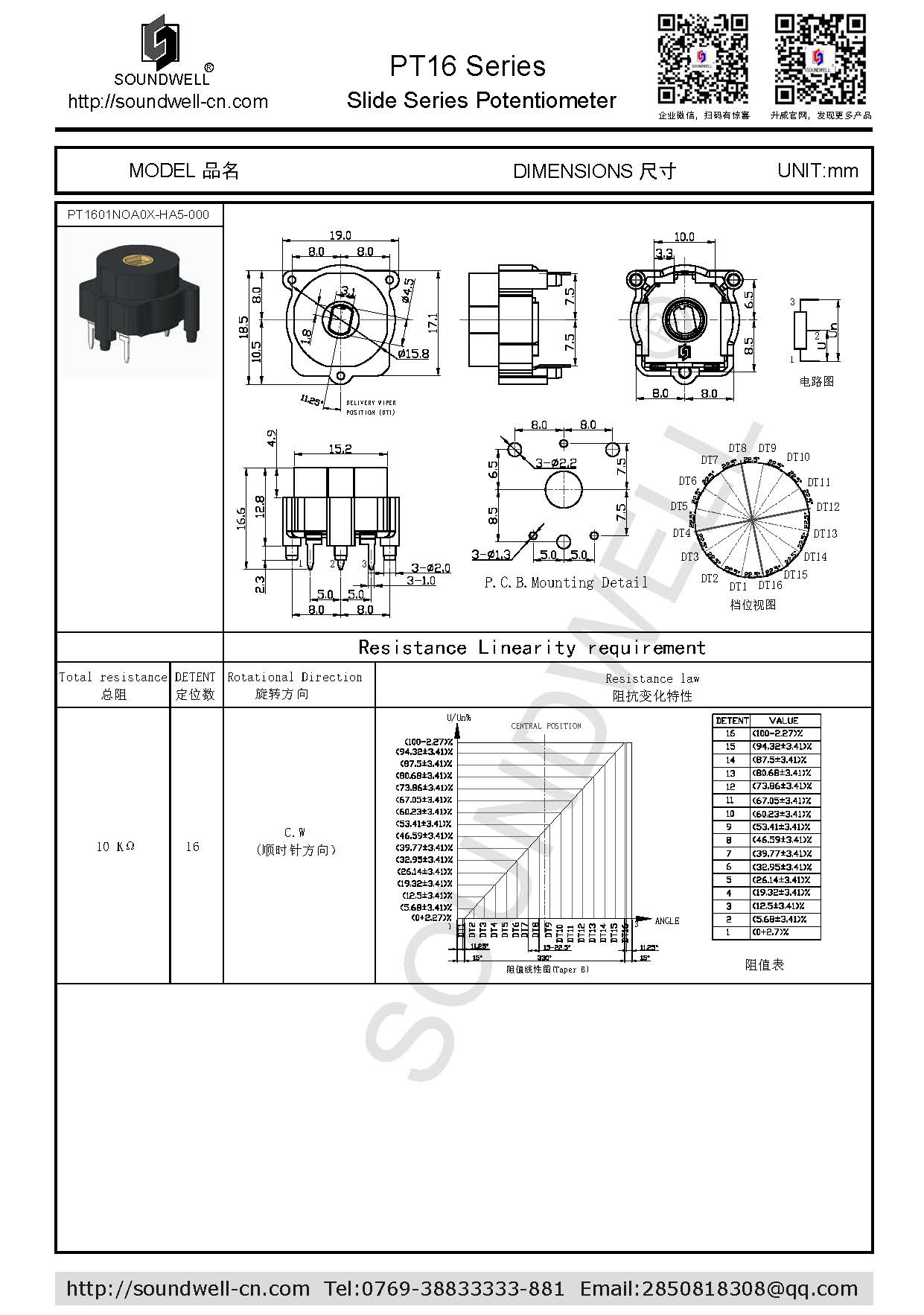 | Main Specifications: | Dimensions: 16mm; Number of detent: 16; Total resistance: 10KΩ; Residual resistance: R1,2: ≤ 10 Ω;R2,3: ≤ 20 Ω; Resistance Taper: B; Operating temperature: -25℃ ~70℃; Rotational life: 10,000 cycles Min; |